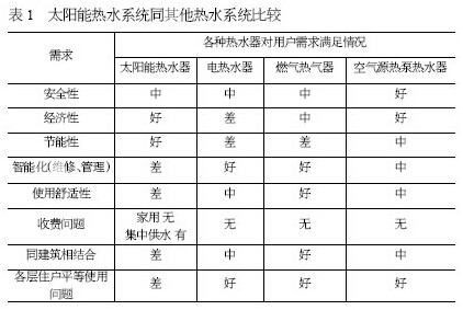 0 引言 隨著人們生活水平的不斷提高,對熱水使用的要求也越來越高,不僅僅滿足于洗澡用熱水,人們生活的很多方面都需要熱水,但是消費者在使用太陽能熱水器的體驗卻不是很好(經(jīng)常壞、水壓不夠、舒適度不夠、使用麻煩),使很多用戶不愿使用太陽能熱水器,高層住宅數(shù)量不斷增加,給太陽能熱水器安裝加大了難度,一些太陽能熱水系統(tǒng)工程已經(jīng)安裝,因系統(tǒng)設(shè)計存在缺陷,使用效果不好,有的集中集熱太陽能熱水系統(tǒng),初期熱水價格高,用戶不愿意用,形成惡性循環(huán),最后廢棄,有些陽臺式壁掛太陽能工程,使用效果不好,用戶拆了。結(jié)果是政府大力在“推”,開發(fā)商在“應(yīng)付”,用戶滿意度不高,小區(qū)物業(yè)管理感到麻煩。 1 城鎮(zhèn)住宅用太陽能熱水系統(tǒng)需要滿足的要求一個好的太陽能熱水系統(tǒng)需要滿足以下要求: 1.安全、防雷、防凍、防過熱(燙傷)。 2.經(jīng)濟、性價比高、使用成本低。 3.節(jié)能、效率高。 4.智能(具備遠程管理)、管理方便、售后服務(wù)快捷方便。 5.舒適、滿足用戶提高了的用熱水需要,調(diào)溫方便,出水壓力高。 6.最好不需要收費。 7.同建筑物結(jié)合良好。 8.各層住戶能平等享受熱水使用權(quán)利。 按照上述8個方面需求,太陽能熱水系統(tǒng)同其他熱水系統(tǒng)比較(見表1)。