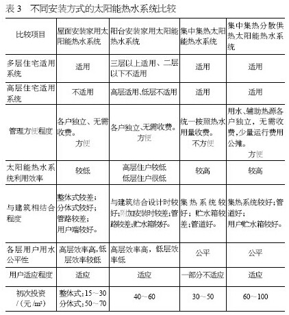 2.2 集中集熱分散供熱太陽能熱水系統(tǒng)優(yōu)點 2.2.1 管理方便,用戶用水和輔助加熱用能每戶獨立(同家用太陽能熱水系統(tǒng)一樣),使用中不需要向用戶收費。集熱系統(tǒng)少量的運行費用進入公共設(shè)施(電梯、樓道燈)費用,各戶分攤。 2.2.2 系統(tǒng)效率高,太陽能集熱器共用,將太陽能收集的能量輸送給使用熱水的用戶,提高了太陽能集熱系統(tǒng)的使用效率。 2.2.3 與建筑物相結(jié)合,太陽能集熱設(shè)備安裝在屋面,與屋面結(jié)合為一體;熱媒輸送管道安裝在管道井;戶用貯水箱安裝在用戶陽臺、衛(wèi)生間等部位。 2.2.4 各層住戶能公平使用熱水,多層、高層住宅的各層住戶都可以使用太陽能熱水,具備公平性。 2.2.5 使用舒適度較好,用戶貯水箱承壓運行,冷熱水等壓,調(diào)溫方便,熱水壓力高。 3集中集熱分散供熱太陽能系統(tǒng)關(guān)鍵技術(shù) 3.1 防止“能量倒輸”同時使系統(tǒng)高效運行,集中集熱分散供熱太陽能熱水系統(tǒng)中有多個貯水箱,每戶用水不同,會使每個貯水箱的溫度出現(xiàn)較大差別,當某個或某幾個用戶貯水箱溫度較高,在集熱循環(huán)某個時段,由于介質(zhì)的溫度低于貯水箱中的水溫,傳熱介質(zhì)經(jīng)過換熱器時將貯水箱的能量帶到集熱循環(huán)系統(tǒng)中,這種現(xiàn)象稱“能量倒輸”。出現(xiàn)“能量倒輸”現(xiàn)象,對于這個或這些用戶將產(chǎn)生能量損失,就存在熱水使用不公平,因此集中集熱分散供熱太陽能熱水系統(tǒng)必須防止產(chǎn)生“能量倒輸”現(xiàn)象,但不能通過犧牲系統(tǒng)效率或設(shè)備壽命來解決。 3.2 保證均勻得熱,將集熱器收集到的太陽能能量均勻地輸送到每個用戶,使每個用戶能均衡的得到太陽能能量,公平地使用太陽能熱水系統(tǒng)提供的熱水,通過管道設(shè)計的同程或同阻力設(shè)計方法可以做到,滿足用戶隨時都能使用熱水的需求。 4不同安裝方式的太陽能熱水系統(tǒng)比較(見表3)